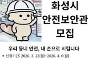 안녕일보 배윤 기자 | 화성특례시는 지역 내 안전문화 확산과 생활 속 위험요소의 사전 발굴·제거를 위해 안전보안관 145명을 공개 모집한다고 23일 밝혔다. 모집 기간은 3월 23일부터 4월 6일까지며, 공고일 기준 주민등록상 화성시에 거주하는 시민이면 누구나 지원할 수 있다. 안전보안관의 주요 활동은 ▲안전신문고 앱을 활용한 7대 안전무시 관행 및 생활 속 안전위반 행위 신고 ▲지역행사 및 축제 안전점검 지원 ▲안전문화 캠페인 참여 등이다. 안전보안관은 위촉일로부터 2년간 활동하며, 제안사항이 수용될 경우 ‘1365 자원봉사포털’을 통해 봉사시간을 인정받는다. 참여를 희망하는 시민은 화성시청 홈페이지 ‘시정알림방’ 게시판에서 ‘안전보안관’을 검색해 신청서를 내려받아 작성 후 안전정책과 안전문화교육팀 전자우편으로 제출하면 된다. 김영준 안전정책과장은 “시민이 직접 참여하는 안전관리 체계는 지역 안전 수준을 높이는 중요한 기반”이라며 “일상 속 위험요소를 세심하게 살피고 개선해 나가는 활동을 통해 보다 촘촘한 안전환경을 조성해 나가겠다”고 말했다.